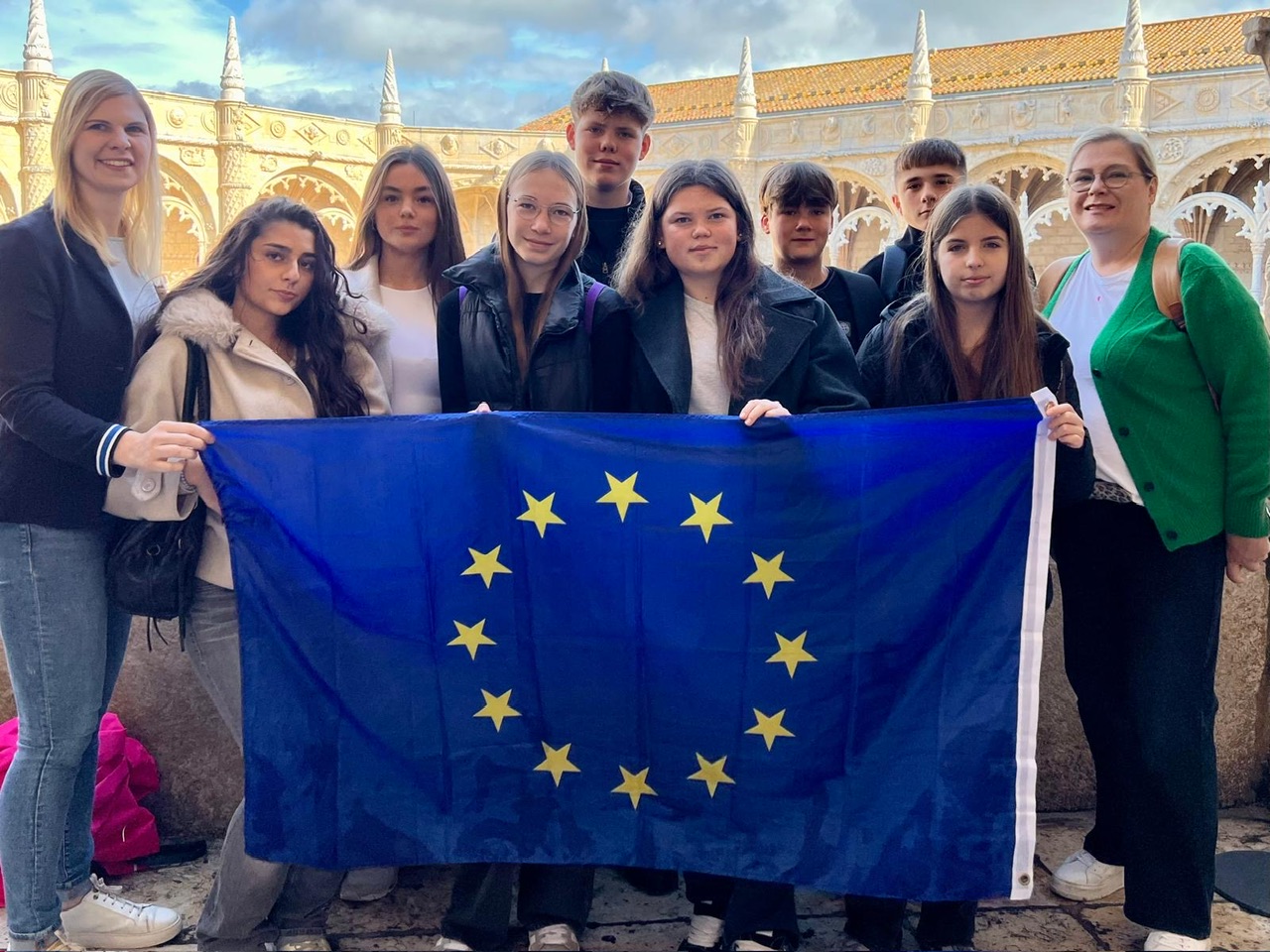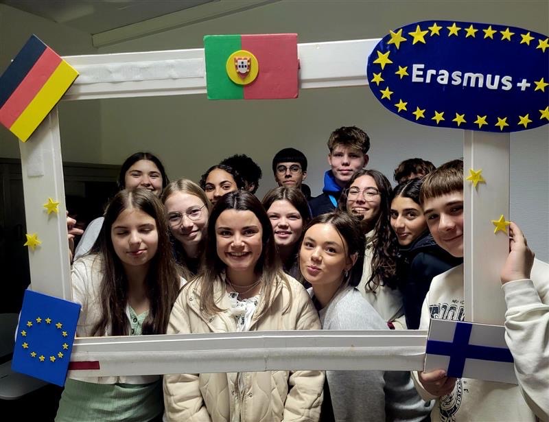 Vom 9. bis 15. November reisten acht Schülerinnen und Schüler aus dem Jahrgang 9 nach Alenquer in Portugal, um gemeinsam mit unserer finnischen Partnerschule aus Lemi an einer Erasmus+-Woche teilzunehmen. Der Austausch ist Teil des Neigungsfachs Erasmus+, in dem unsere Schülerinnen und Schüler im Laufe des Schuljahres internationale Erfahrungen sammeln, selbst Gastgeber werden und gemeinsam am Projekt „Roots and Routes – connecting heritage and horizons“ arbeiten. Schon der erste Tag an unserer Partnerschule, dem Agrupamento de Escolas Damião de Gois in Alenquer, machte deutlich, wie herzlich wir willkommen geheißen wurden: Ein Buffet mit landestypischen Spezialitäten, viele offene Gesichter und eine warme Atmosphäre sorgten für einen perfekten Start. Viele unserer Schülerinnen und Schüler berichteten schnell davon, wie gut sie sich in ihren Gastfamilien aufgehoben fühlten, ein schönes Zeichen für die besondere Gastfreundschaft, die uns die ganze Woche über begleitet hat.